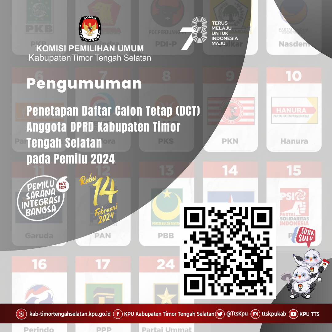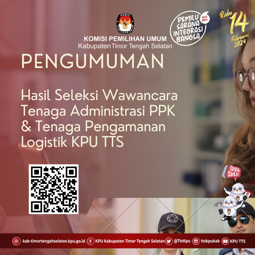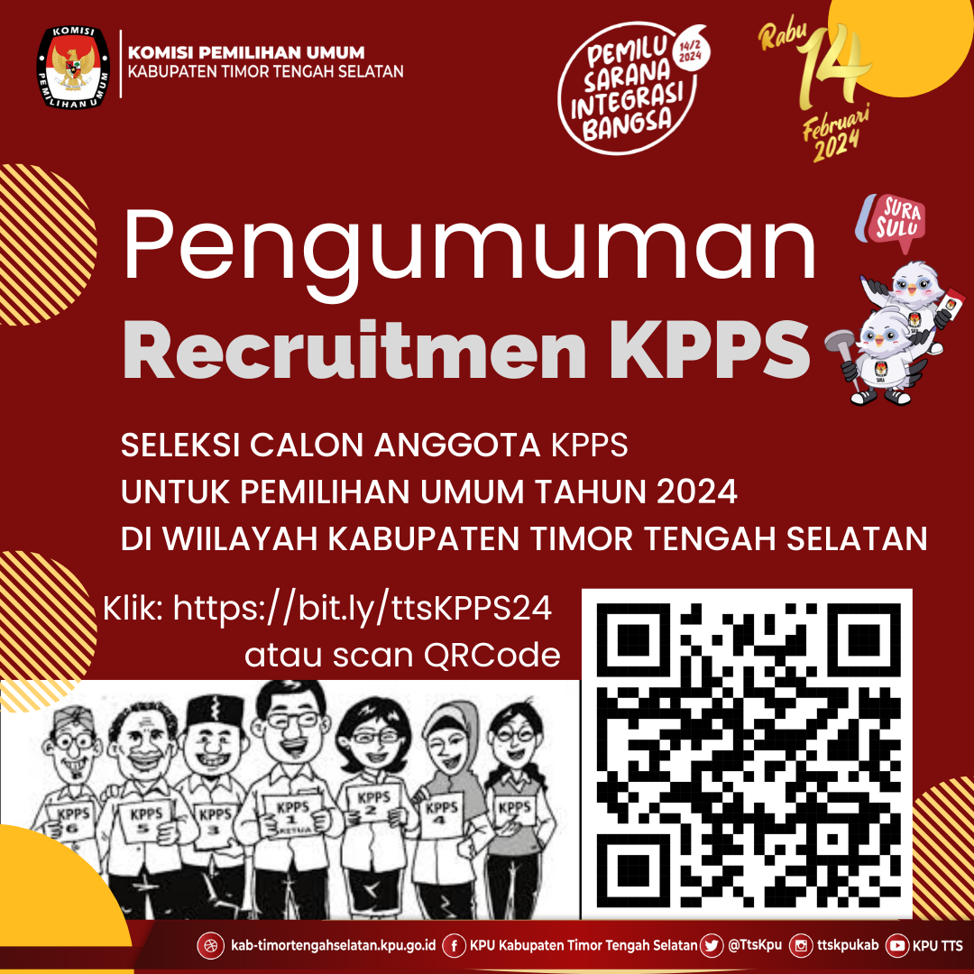 PENGUMUMAN SELEKSI CALON ANGGOTA KPPS UNTUK PEMILIHAN UMUM TAHUN 2024 DI WILAYAH KABUPATEN TIMOR TENGAH SELATAN Dalam rangka pembentukan Kelompok Penyelenggara Pemungutan Suara (KPPS) untuk Pemilihan Umum Tahun 2024, Komisi Pemilihan Umum Kabupaten Timor Tengah Selatan mengundang Warga Negara Indonesia yang memenuhi persyaratan untuk mendaftarkan diri menjadi anggota KPPS untuk Pemilihan Umum Tahun 2024 dengan ketentuan sebagai berikut: Persyaratan Anggota KPPS: a. Warga Negara Indonesia; b. berusia paling rendah 17 (tujuh belas) tahun dan diutamakan paling tinggi 55 (lima puluh lima) tahun; c. setia kepada Pancasila sebagai dasar Negara, Undang-Undang Dasar Negara Republik Indonesia Tahun 1945, Negara Kesatuan Republik Indonesia, Bhinneka Tunggal Ika, dan cita-cita Proklamasi 17 Agustus 1945; d. mempunyai integritas, pribadi yang kuat, jujur dan adil; e. tidak menjadi anggota Partai Politik yang dinyatakan dengan surat pernyataan yang sah, atau sekurang-kurangnya 5 (lima) tahun tidak lagi menjadi anggota partai politik yang dibuktikan dengan surat keterangan dari pengurus partai politik yang bersangkutan; f. berdomisili dalam wilayah kerja KPPS; g. mampu secara jasmani, rohani, dan bebas dari penyalahgunaan narkotika; h. berpendidikan paling rendah sekolah menengah atas atau sederajat; dan i. tidak pernah dipidana penjara berdasarkan putusan pengadilan yang telah memeroleh kekuatan hukum tetap karena melakukan tindak pidana yang diancam dengan pidana penjara 5 (lima) tahun atau lebih. Kelengkapan Dokumen Persyaratan: a. Surat pendaftaran sebagai calon anggota KPPS; b. Fotokopi Kartu Tanda Penduduk Elektronik; c. Fotokopi ijazah sekolah menengah atas/sederajat atau ijazah terakhir; d. Surat pernyataan dalam satu dokumen yang menyatakan : 1. setia kepada Pancasila sebagai dasar Negara, Undang-Undang Dasar Negara Republik Indonesia Tahun 1945, Negara Kesatuan Republik Indonesia, Bhinneka Tunggal Ika, dan cita-cita Proklamasi 17 Agustus 1945; 2. mempunyai integritas, pribadi yang kuat, jujur dan adil; 3. tidak menjadi anggota Partai Politik; 4. tidak memiliki penyakit penyerta (komorbiditas); 5. sehat secara rohani; 6. bebas dari penyalahgunaan narkotika; 7. tidak pernah dipidana penjara berdasarkan putusan pengadilan yang telah memperoleh kekuatan hukum tetap karena melakukan tindak pidana yang diancam dengan pidana penjara 5 (lima) tahun atau lebih; 8. tidak pernah dijatuhi sanksi pemberhentian tetap oleh KPU Kabupaten/Kota atau Dewan Kehormatan Penyelenggara Pemilu; 9. tidak berada dalam ikatan perkawinan dengan sesama penyelenggara Pemilu; 10. tidak menjadi tim kampanye atau tim pemenangan atau saksi peserta Pemilu atau Pemilihan pada penyelenggaraan Pemilu dan Pemilihan paling singkat dalam 5 (lima) tahun terakhir; 11. mempunyai kemampuan dan kecakapan dalam membaca, menulis dan berhitung; dan 12. mampu mengoperasikan perangkat teknologi informasi. e. Surat keterangan dari partai politik yang bersangkutan bagi calon yang paling singkat 5 (lima) tahun tidak lagi menjadi anggota Partai Politik; f. Surat keterangan sehat jasmani yang dikeluarkan oleh puskesmas, rumah sakit, atau klinik yang termasuk di dalamnya terdapat pemeriksaan tekanan darah, kadar gula darah, dan kolesterol; g. Daftar Riwayat Hidup; dan h. Pas Foto Berwarna 4x6. Surat Pendaftaran dan kelengkapan dokumen disampaikan kepada PPS pada Kelurahan/Desa masing-masing sejak tanggal 11 Desember 2023 sampai dengan tanggal 20 Desember 2023. Selengkapnya klik di: Pengumuman Surat Pendaftaran Riwayat Hidup Surat Pernyataan Meme SDM KPU Kabupaten Timor Tengah Selatan