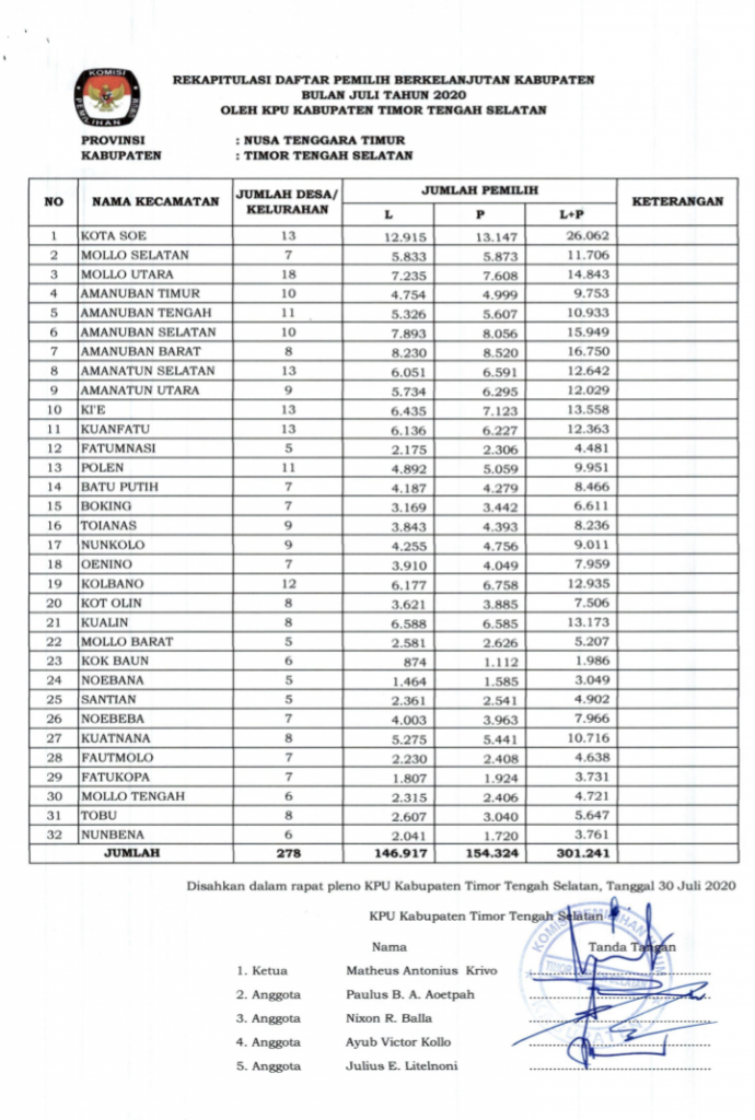 Rekapitulasi Daftar Pemilih Berkelanjutan Bulan Juli 2020 Kabupaten TTS