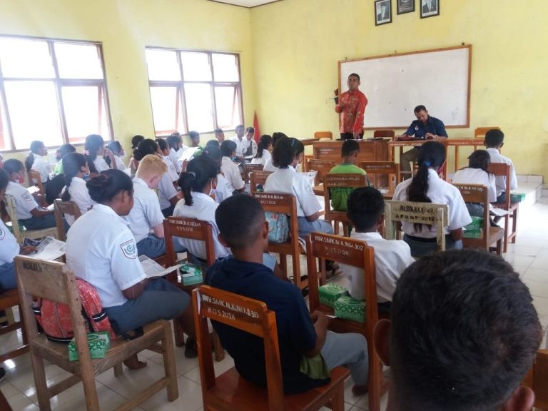 Siswa-siswi SMK N Kualin mengikuti sosialisasi di kelas yang dikoordinir oleh Ketua Divisi Perencanaan Data dan Informasi Paul Aoetpah