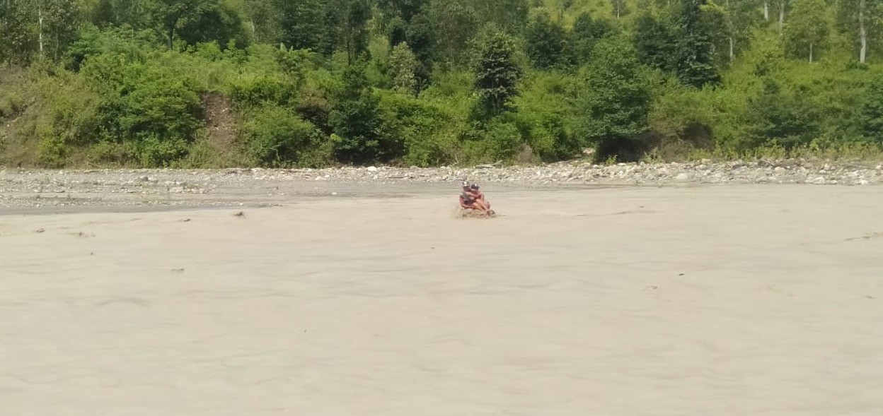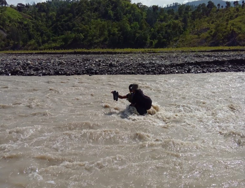 Pantarlih a.n Mirna Fay selalu didampingi oleh bapak kandung Yacob Fay saat kegiatan coklit menyeberangi Sungai Noebesi (Klik di sini untuk melihat video distribusi Model A dan alat kelengkapan Pantarlih)