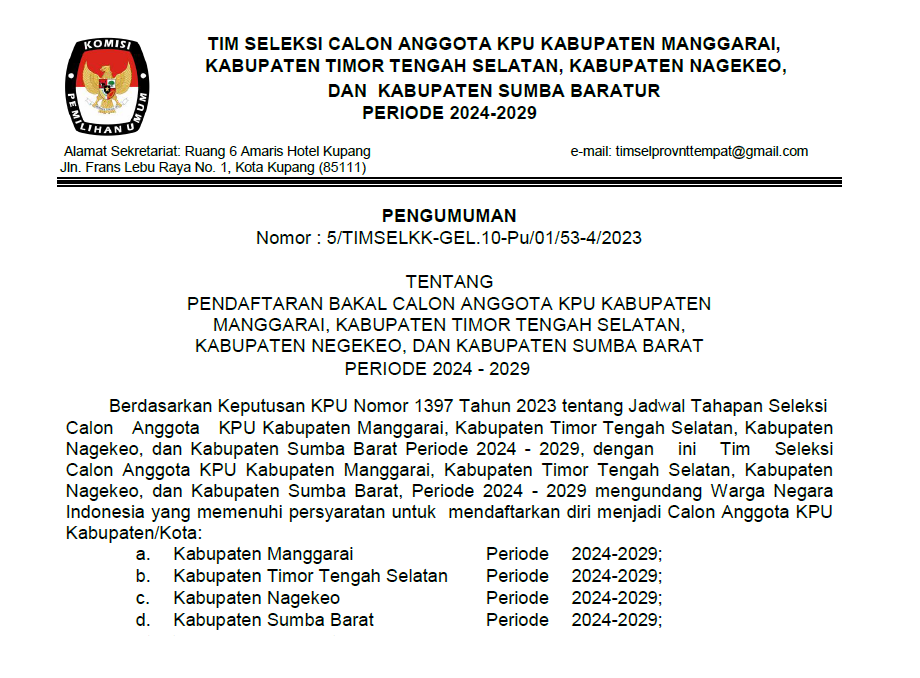 .PENGUMUMAN Nomor : 5/TIMSELKK-GEL.10 – Pu/01/53.3/2023/TIMSELPROV-GEL.XPu/01/64/2023 TENTANG PENDAFTARAN BAKAL CALON ANGGOTA KPU KABUPATEN BELU, KABUPATEN MANGGARAI TIMUR, KABUPATEN ROTE NDAO, DAN KABUPATEN SUMBA TIMUR PERIODE 2024-2029