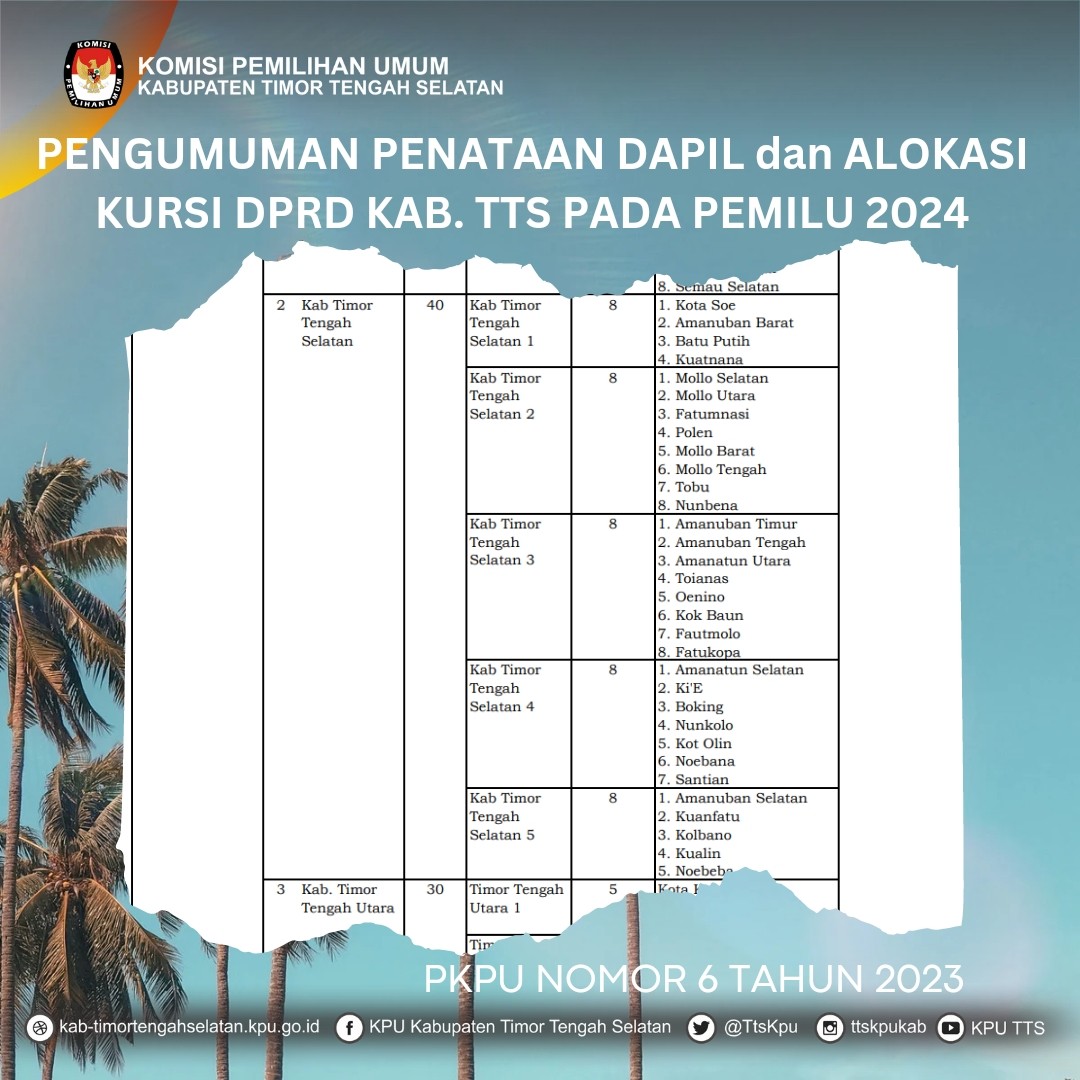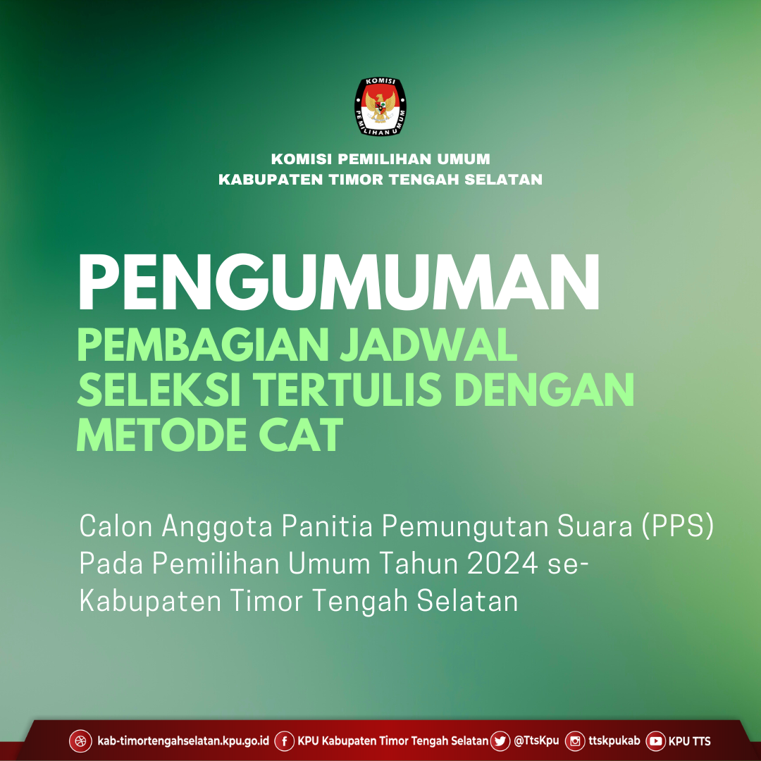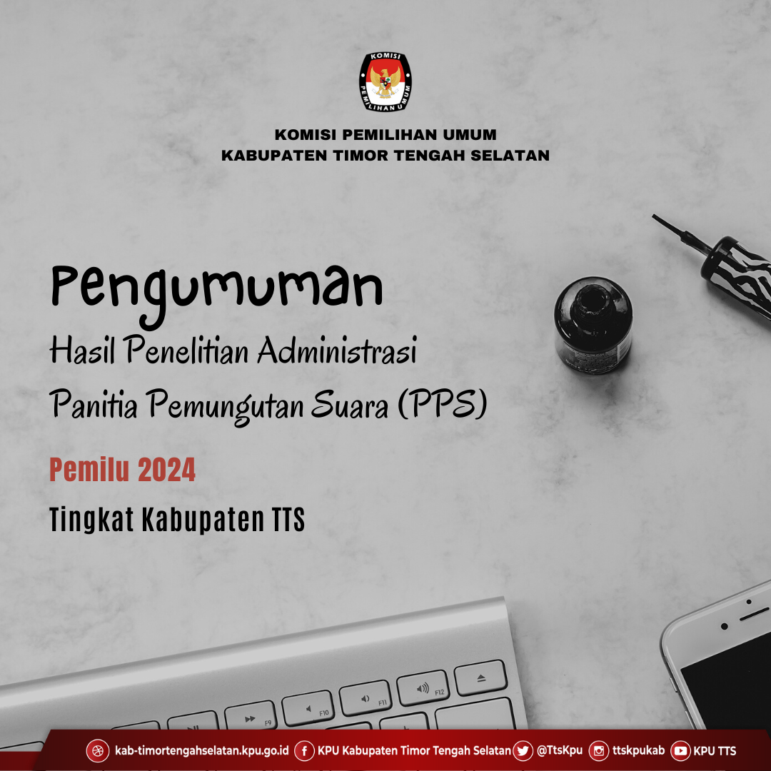 DOWNLOAD PENGUMUMAN PENGUMUMAN SELEKSI TENAGA PENDUKUNG SEKRETARIAT PANITIA PEMILIHAN KECAMATAN (PPK) PADA SEKRETARIAT KPU KABUPATEN TIMOR TENGAH SELATAN DALAM PEMILIHAN UMUM TAHUN 2024 PERSYARATAN UMUM Warga negara Indonesia; Berusia serendah-rendahnya 18 (delapan belas) tahun dan berusia paling tinggi 40 (empat puluh) tahun; Tidak menjadi anggota/ pengurus Partai Politik/ terlibat politik praktis; Memiliki kualifikasi pendidikan minimal SLTA/Sederajat; Sehat jasmani dan rohani; Berkelakuan baik/tidak pernah dijatuhi hukuman pidana; Tidak pernah diberhentikan dengan tidak hormat sebagai pegawai di suatu instansi, baik instansi pemerintah maupun swasta; Berdomisili di wilayah Kecamatan yang berada di Kabupaten Timor Tengah Selatan dan dibuktikan dengan KTP Elektronik; Bersedia bekerja penuh waktu; Tidak sedang bekerja atau terikat pekerjaan di instansi/tempat/lembaga lainnya. PERSYARATAN ADMINISTRASI Surat lamaran yang ditandatangani oleh pelamar ditujukan kepada Panitia Penerimaan Tenaga Pendukung dilampiri dengan : Fotocopy ijasah terakhir dan transkip nilai yang dilegalisir; Fotocopy Kartu Tanda Penduduk (KTP) yang masih berlaku; Pas photo terakhir berwarna ukuran 4x6 sebanyak 4 lembar; Daftar Riwayat Hidup dengan melampirkan keterangan pendukung (pelatihan, pengalaman kerja, penghargaan dsb bila ada); Surat pengalaman kerja kerja bila ada; Surat Keterangan Catatan Kepolisian (SKCK) yang masih berlaku; dan Surat Keterangan Sehat dari Dokter Pemerintah. SKCK dan Surat Keterangan sehat dilengkapi setelah dinyatakan lulus seleksi Tenaga Pendukung. TATA CARA PENDAFTARAN Pendaftaran dibuka mulai tanggal 18 s.d 22 Februari 2023 secara online dan offlline; Untuk pendaftaran secara online berkas lamaran dapat dikirim melalui alamat email : kputtssdm2022@gmail.com Untuk pendaftaran offline dapat mengantar berkas lamaran ke kantor KPU Kabupaten Timor Tengah Selatan, Jln. W. Ch. Oematan - Kesetnana, Kota Soe, Kabupaten Timor Tengah Selatan - NTT Untuk informasi selengkapnya dapat menghubungi : Januar ( 081 238 565 202 ) Edi ( 082 144 851 382 ) DOWNLOAD PENGUMUMAN SDM KPU Kabupaten Timor Tengah Selatan