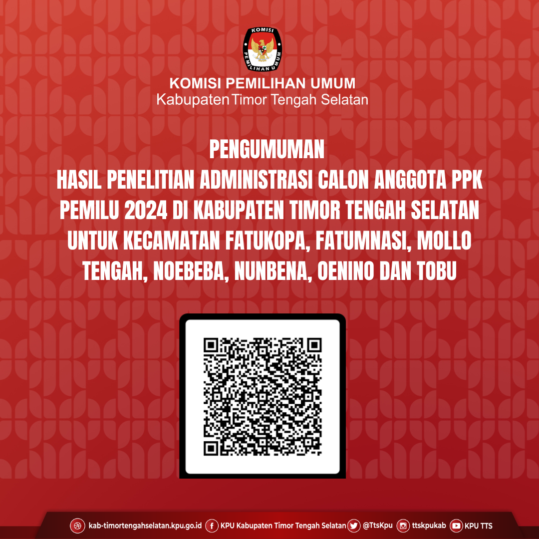 DOWNLOAD PENGUMUMAN HASIL PENELITIAN ADMINISTRASI CALON ANGGOTA PPK PEMILU 2024 DI KABUPATEN TIMOR TENGAH SELATAN UNTUK KECAMATAN FATUKOPA, FATUMNASI, MOLLO TENGAH, NOEBEBA, NUNBENA, OENINO DAN TOBU.