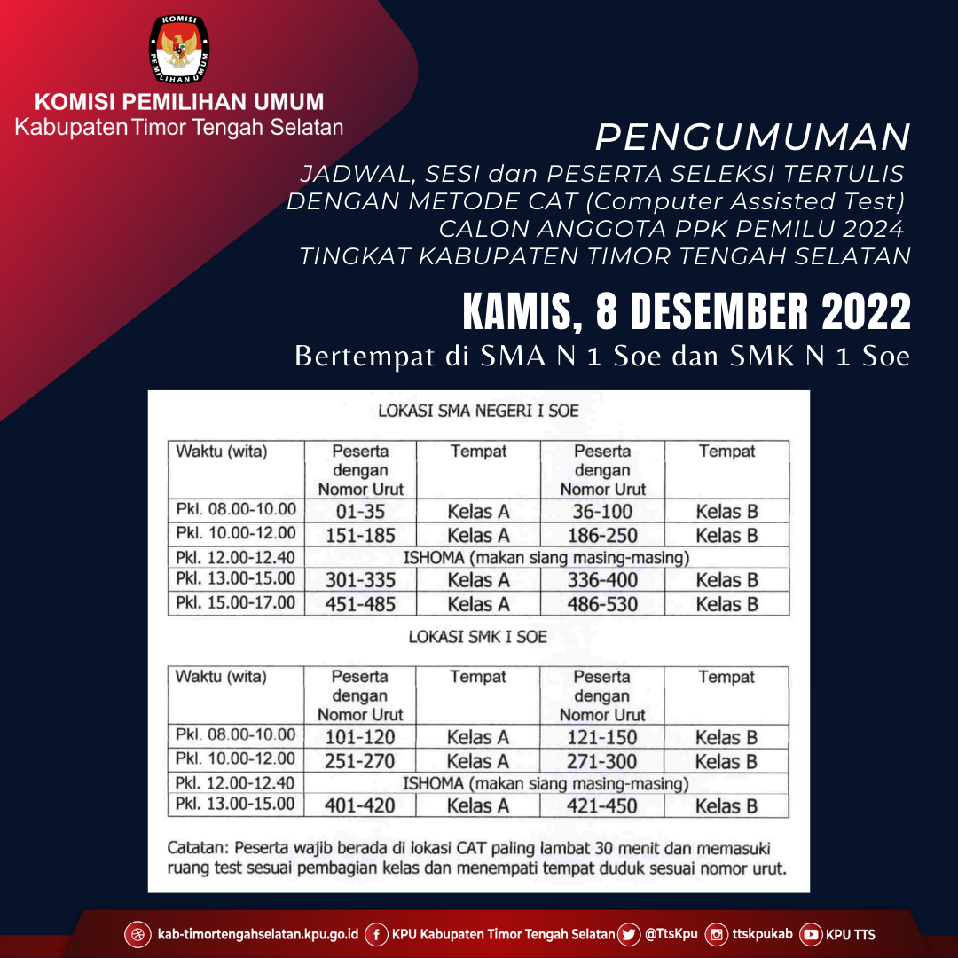DOWNLOAD PENGUMUMAN JADWAL, SESI dan PESERTA SELEKSI TERTULIS DENGAN METODE CAT (Computer Assisted Test) CALON ANGGOTA PPK PEMILU 2024 TINGKAT KABUPATEN TIMOR TENGAH SELATAN